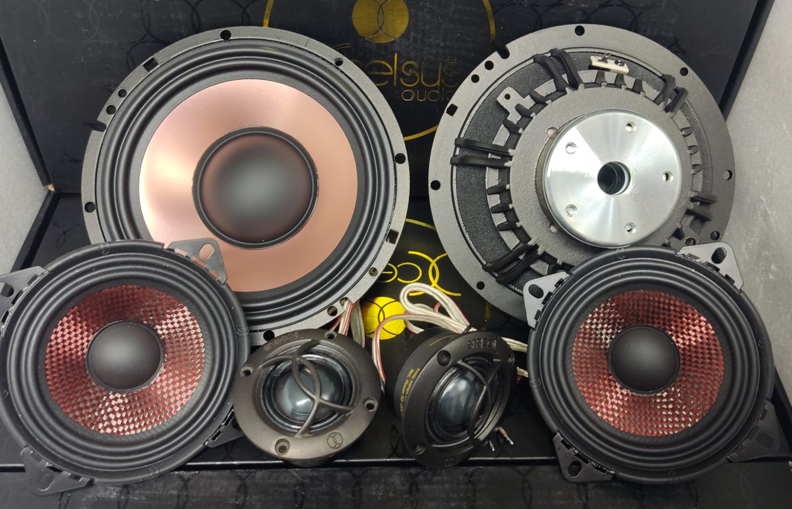 After many samples, we finally chose a construction of a Carbon/Glass fiber mix cone, coupled to a hi-energy neodymium magnet motor that’s supported by our spiderless suspension system.